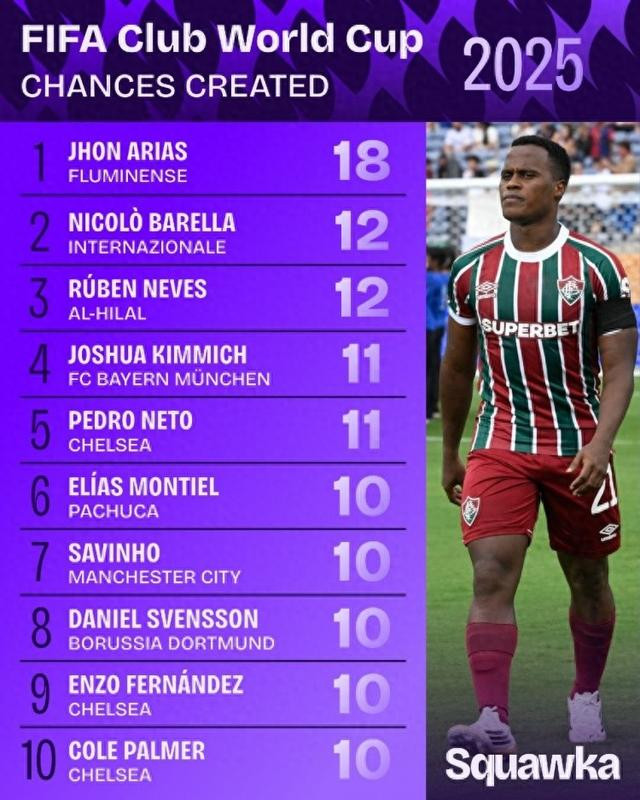 直播吧7月11日讯 本届世俱杯仅剩巴黎vs切尔西的决赛,数据机构squakwa也统计了本届赛事创造机会情况,弗鲁米嫩塞的27岁前锋琼-阿里亚斯独自领跑。 世俱杯创造机会榜: 1.琼-阿里亚斯(弗鲁米嫩塞),18次 2.巴雷拉(国米),12次 3.鲁本-内维斯(利雅得新月),12次 4.基米希(拜仁),11次 5.内托(切尔西),11次 6.埃利亚斯-蒙蒂尔(帕丘卡),10次 7.萨维尼奥(曼城),10次 8.丹尼尔-斯文松(多特),10次 9.恩佐(切尔西),10次 10.帕尔默(切尔西),10次 |
